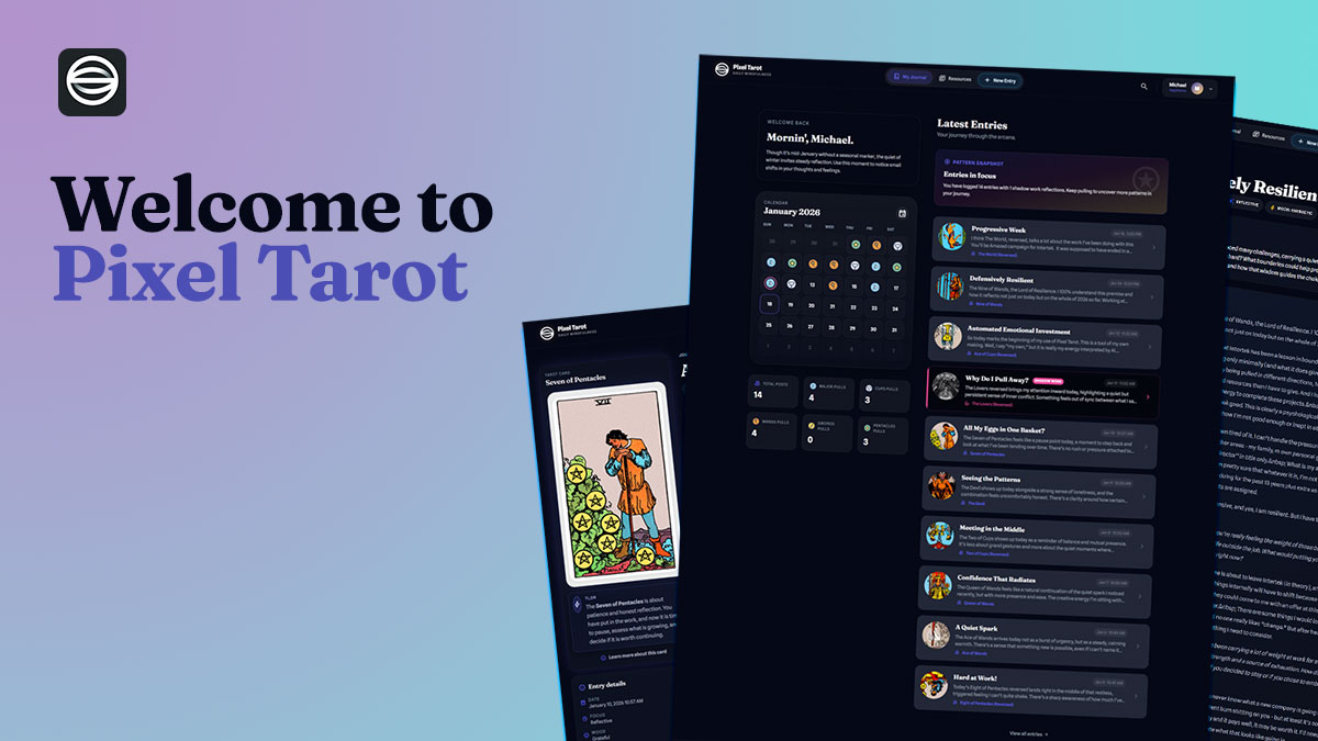 Pixel Tarot is meant to grow with you as a daily tarot journal, supporting reflection over time rather than isolated readings. There’s no right way to do it, no ideal interpretation to reach. Just an opportunity to listen more closely to yourself and to grow from what you discover along the way. Welcome to Pixel Tarot.